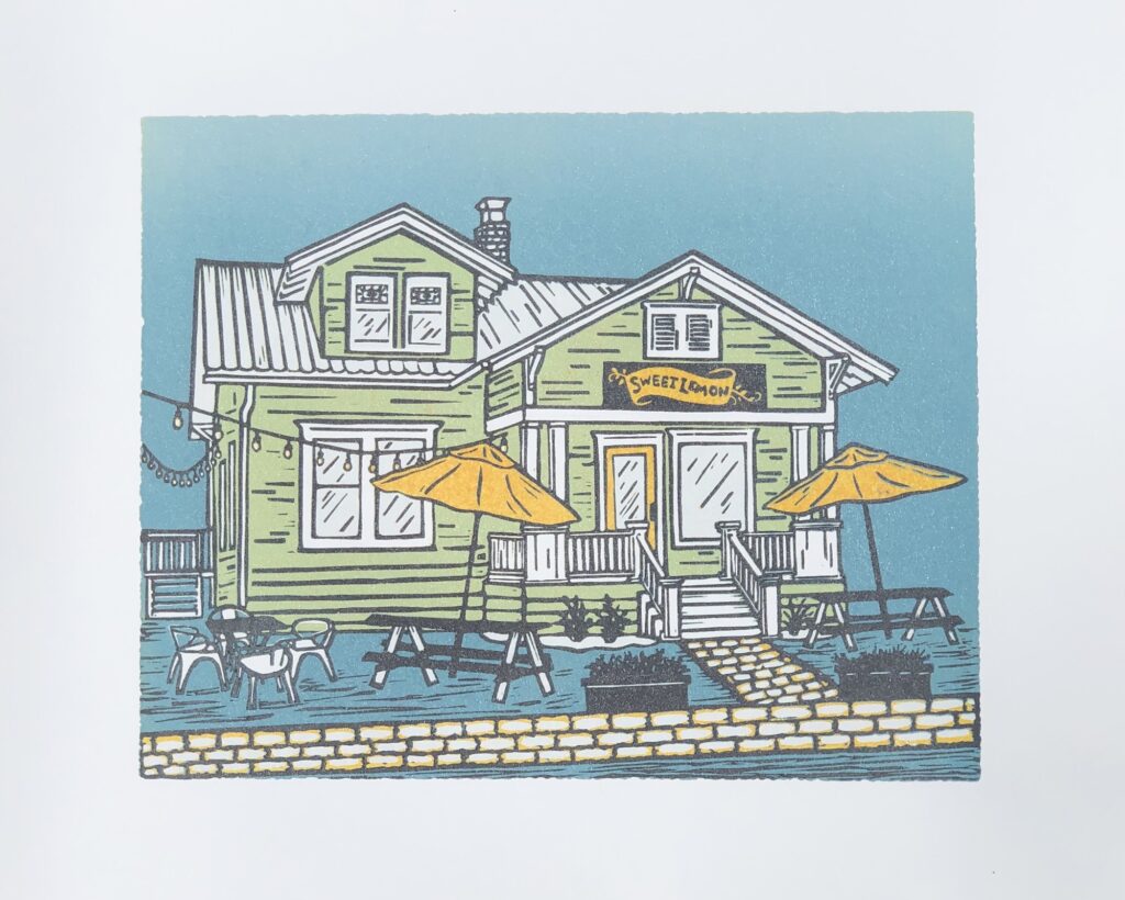 Last month I released this five layer reduction print featuring one of my favorite small businesses in Georgetown: Sweet Lemon Kitchen. The process of creating a print like this can be a little confusing if you’ve never seen it before, so I decided to share a little more about how this print was made!