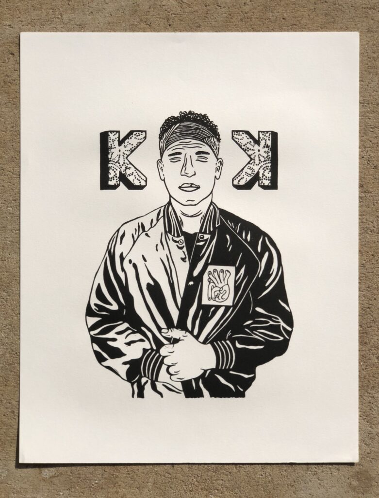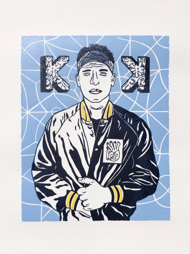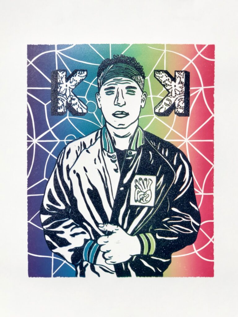 The print features Chad Gardner, the band’s lead singer, songwriter, and producer. While designing the piece, I drew inspiration from several Kings Kaleidoscope albums and their cover artwork. Those who are familiar with the band will recognize the lace pattern in the mirrored Ks, the background design, and the jacket. This was an experimental piece so there are 3 versions of this print in very limited numbers. One with no background, one with a blue background and one with a rainbow background.
