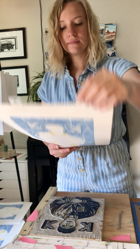 So why did I create this piece? Honestly, just because I wanted to. I typically consider whether my designs will resonate with others, with the goal of the art being purchased. In this case, maybe you can’t relate to the artwork itself, but perhaps you relate to the story behind it. I really enjoyed challenging myself with this design. I had never created a portrait before, so I was eager to give it a try. The print was made using the reduction method, where each layer is printed and then more carving is done on the same block before the next layer is printed in a new color.