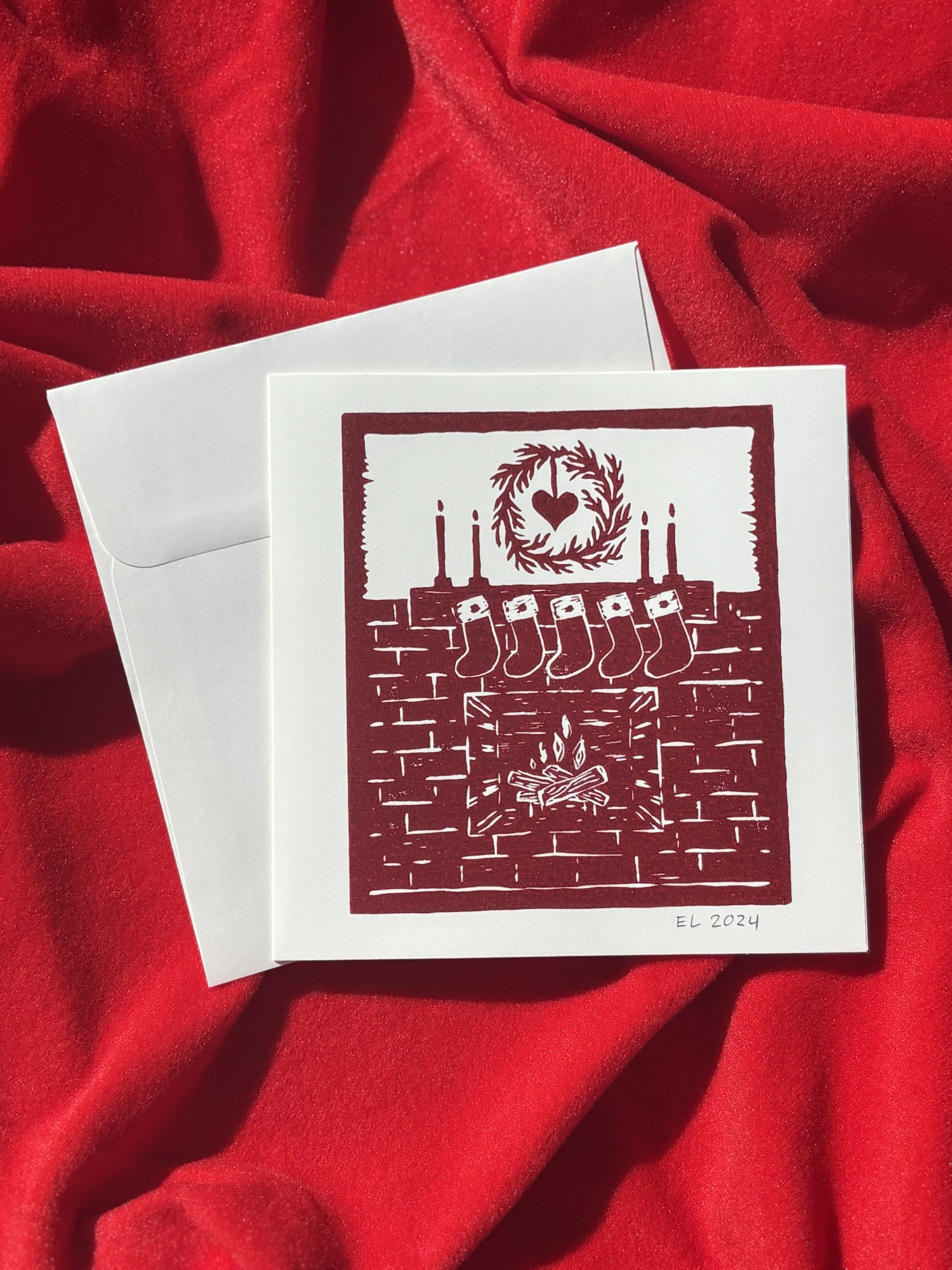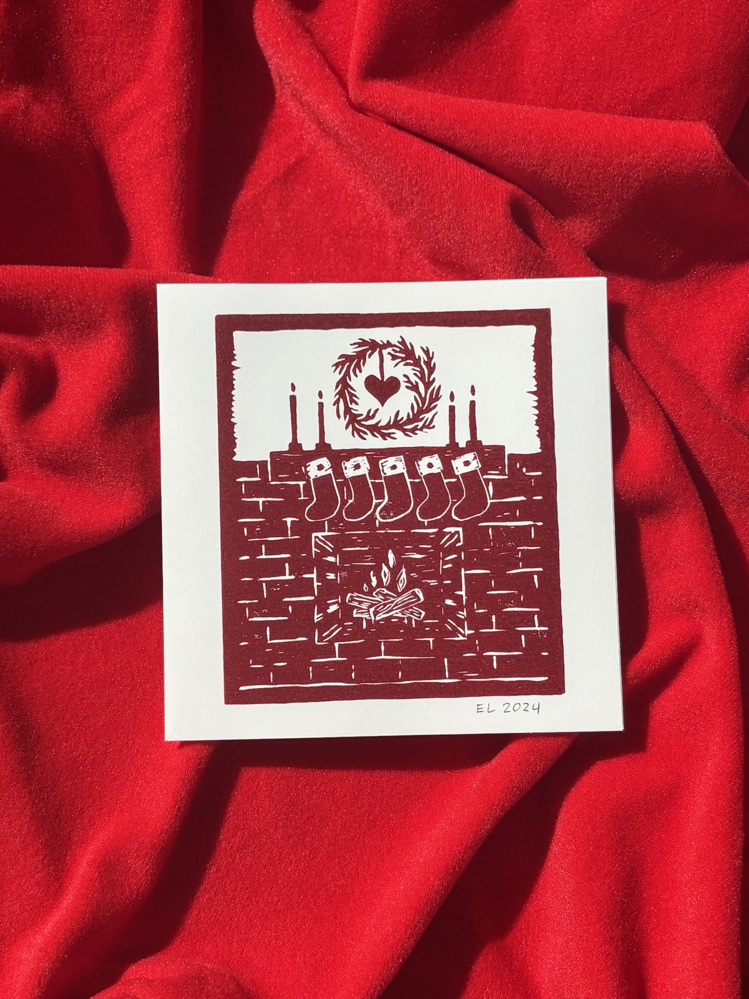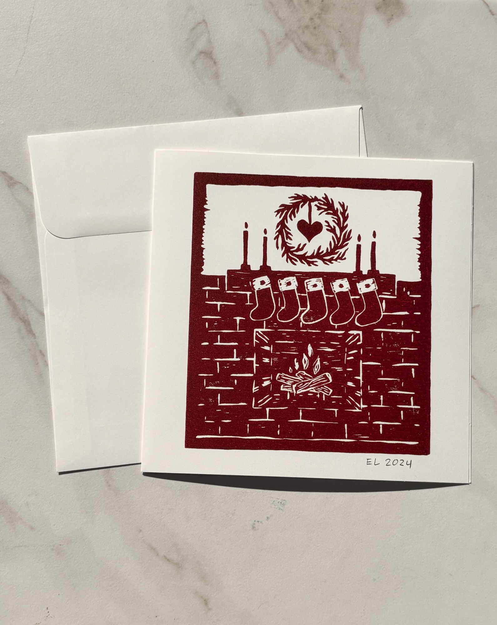 2024 was the year I started a new holiday tradition of making a linocut Christmas card for my friends and family! I was inspired by Harlan Hubbard, a printmaker who made beautiful woodcut prints and created a Christmas card each year from 1931-1987. My 2024 design features my own fireplace, all decked out in Christmas cheer and printed in a deep red. The folded card measures 5.75″ square and comes with a white envelope. The card is blank inside.
