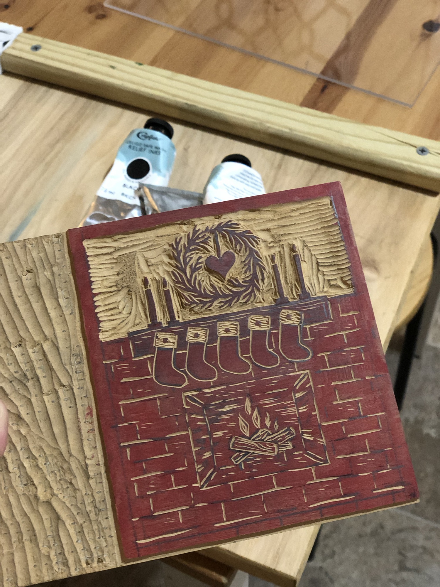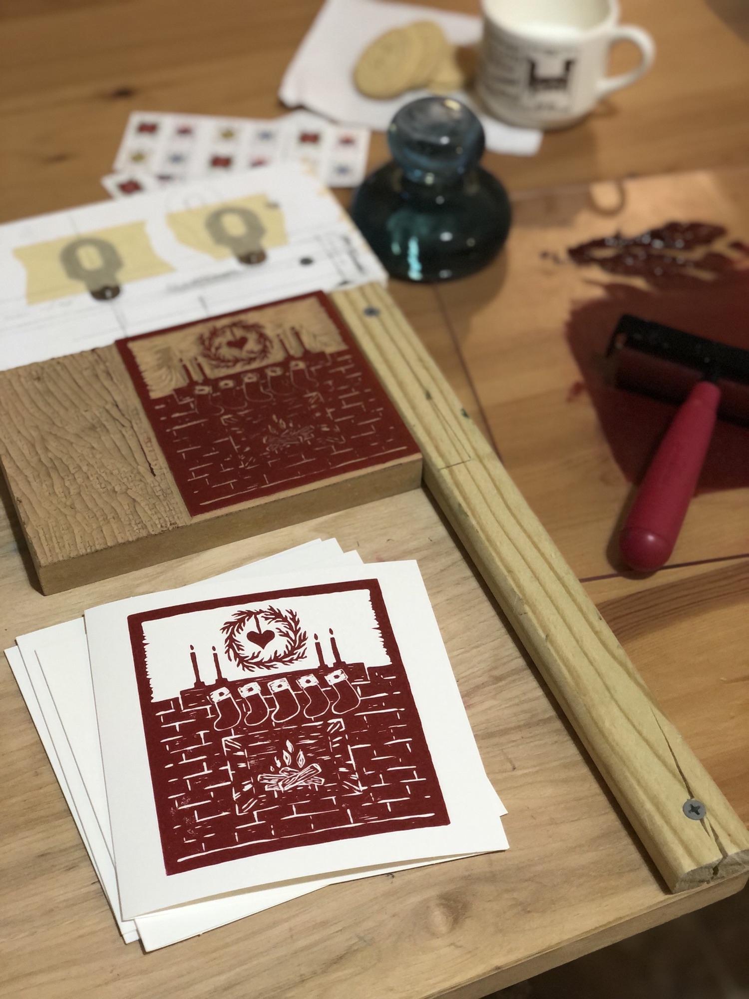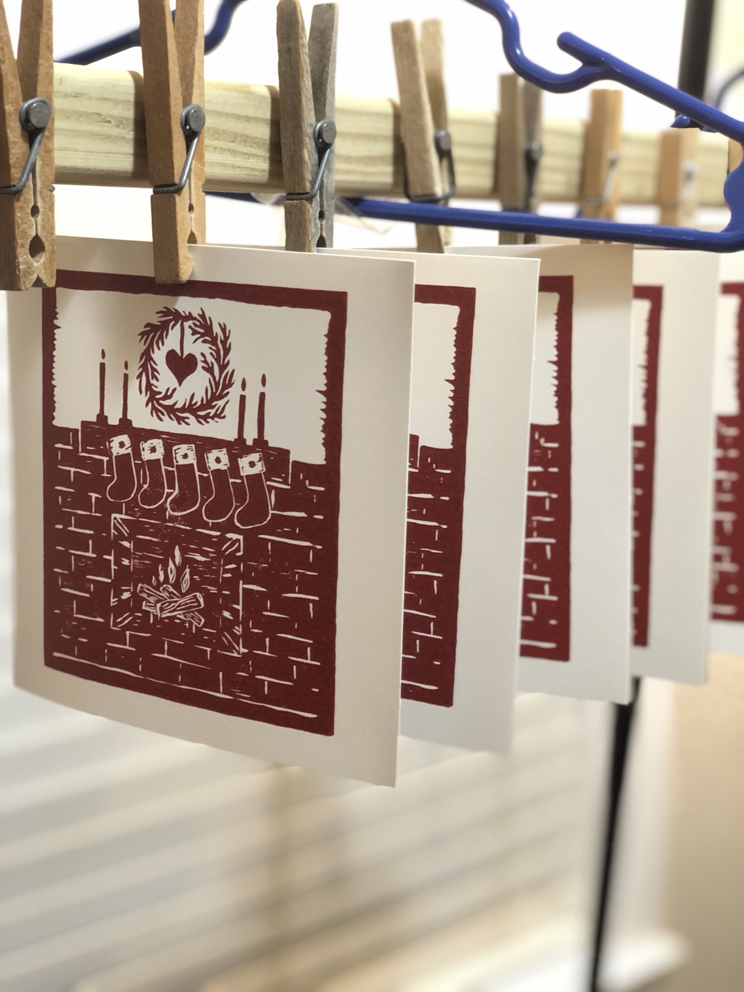 2024 was the year I started a new holiday tradition of making a linocut Christmas card for my friends and family! I was inspired by Harlan Hubbard, a printmaker who made beautiful woodcut prints and created a Christmas card each year from 1931-1987. My 2024 design features my own fireplace, all decked out in Christmas cheer and printed in a deep red. The folded card measures 5.75″ square and comes with a white envelope. The card is blank inside.