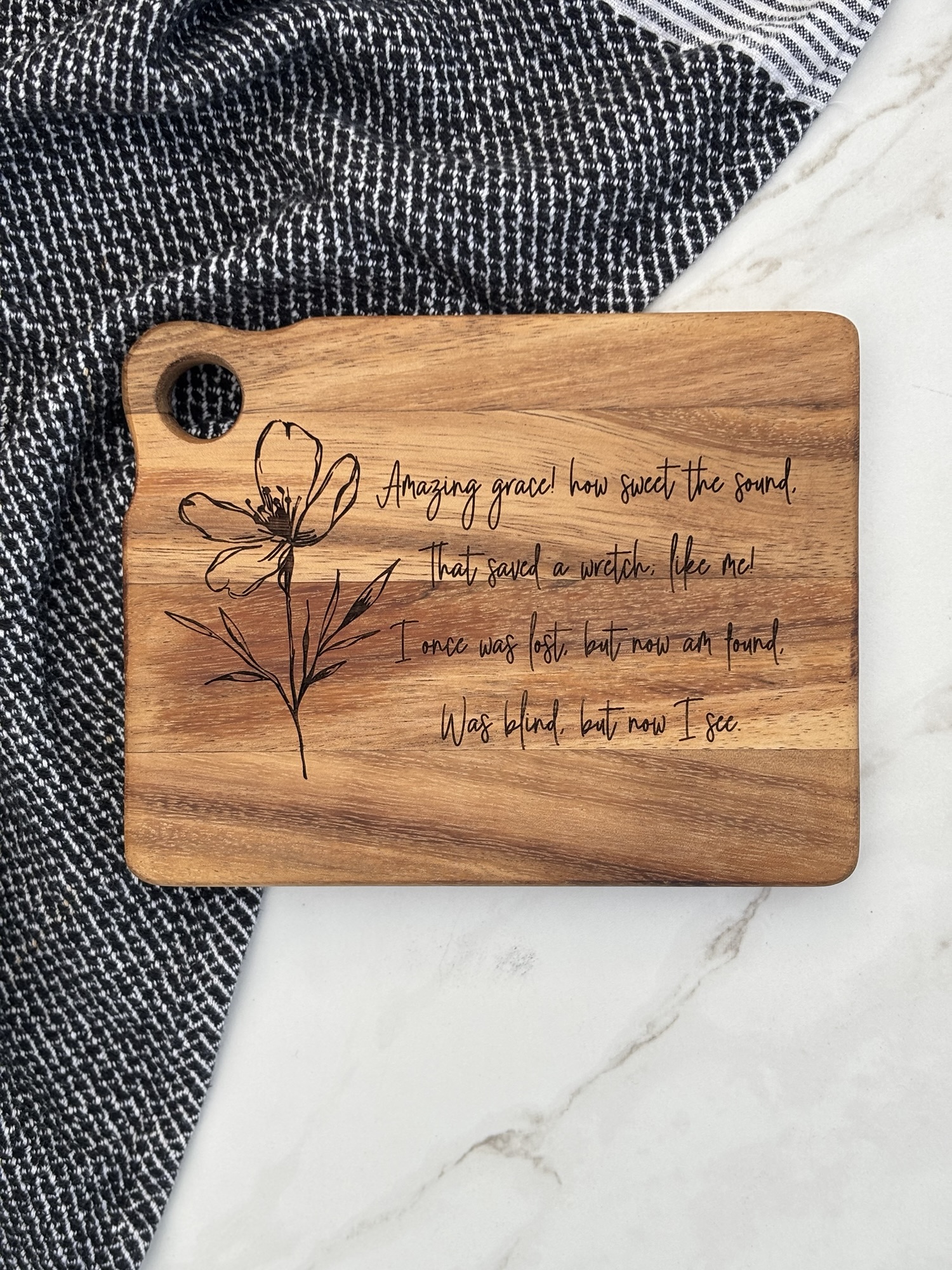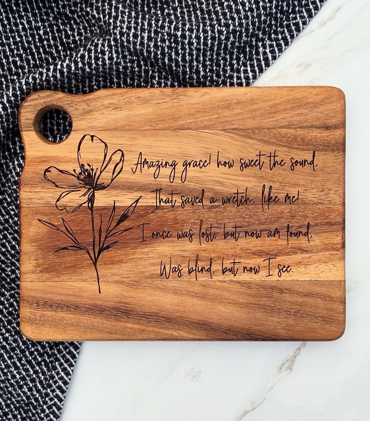 This acacia wood charcuterie board has been engraved with a beautiful floral design and the first verse of the hymn “Amazing Grace”.