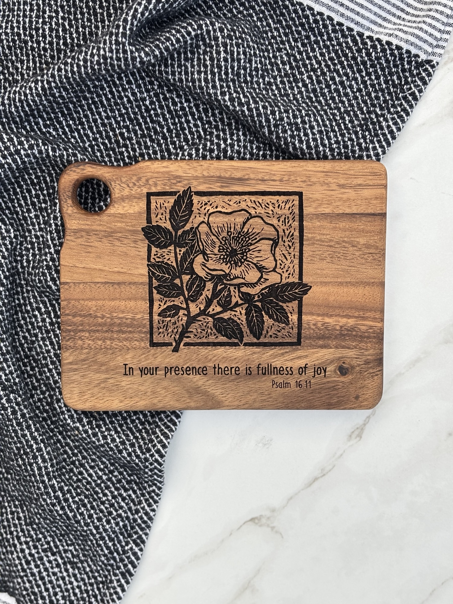 This acacia wood charcuterie board has been engraved with a beautiful floral design and Psalm 16:11: “In your presence there is fullness of joy”