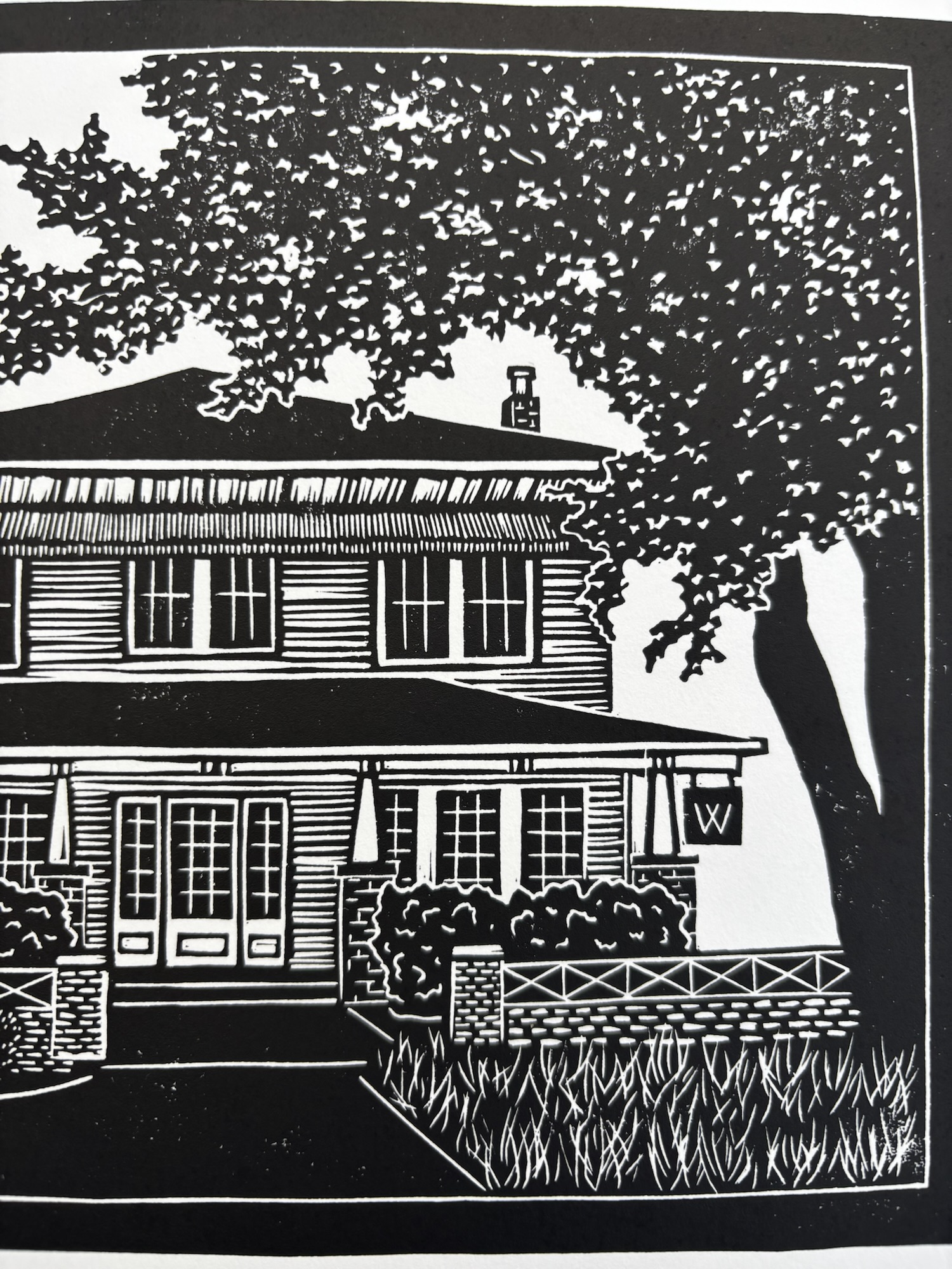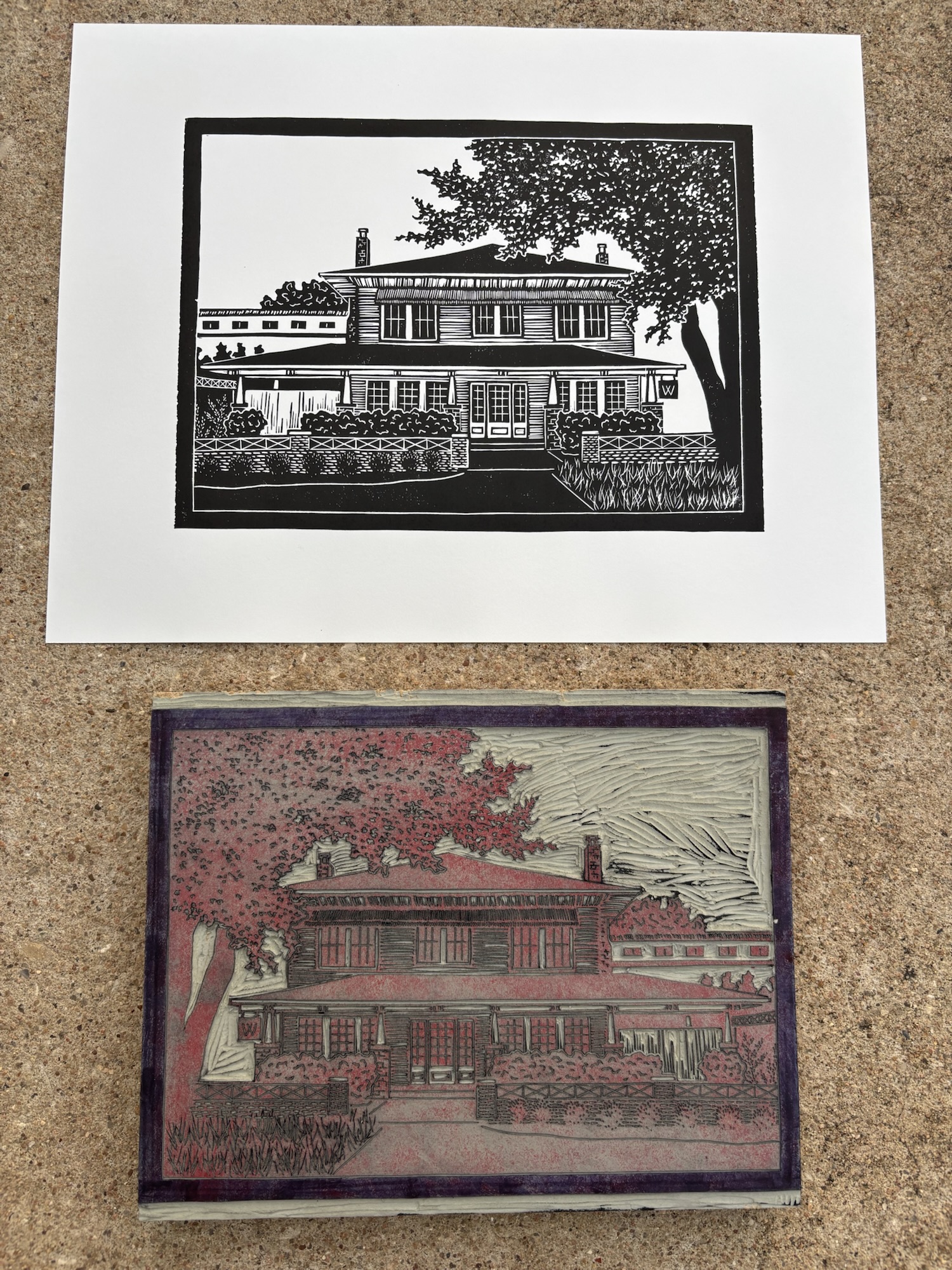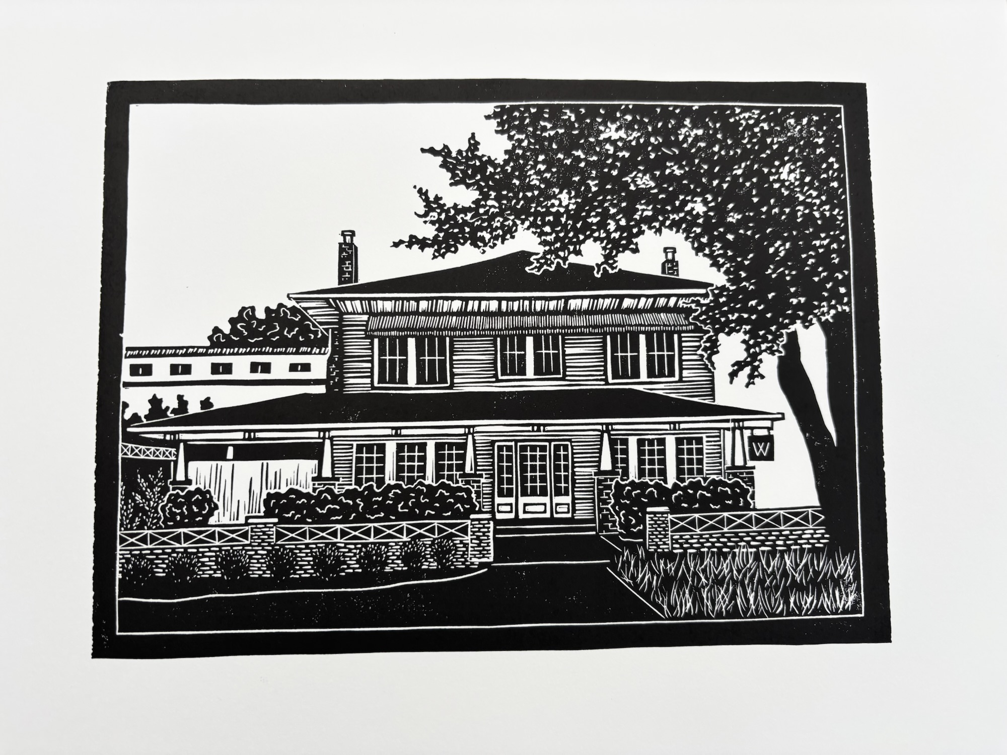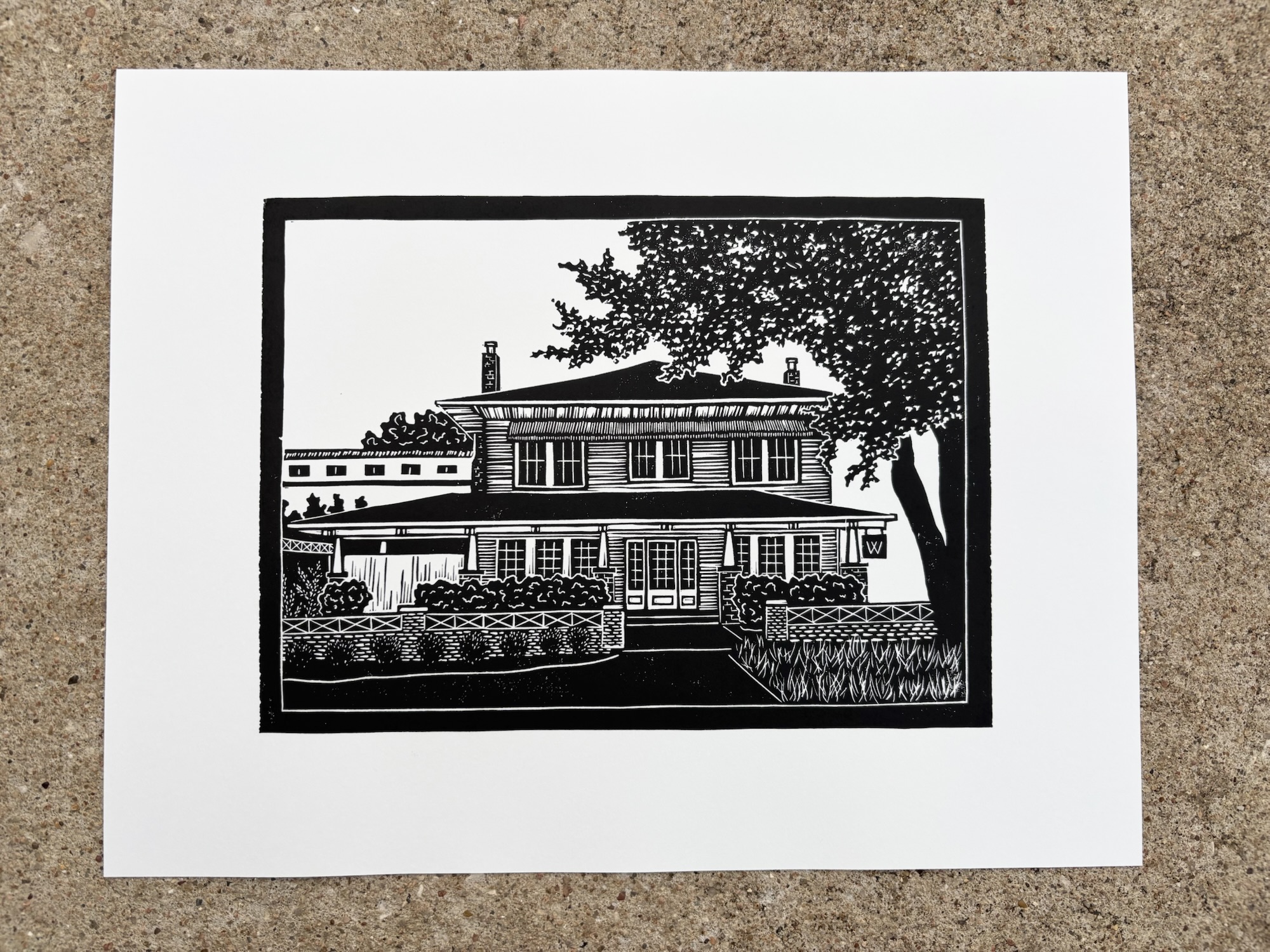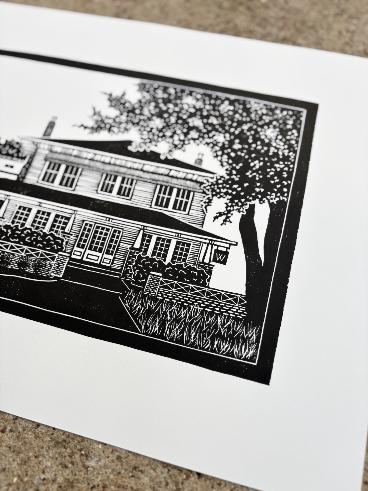 This piece was created completely by my own two hands. Once carved, the linoleum block was inked with black oil-based printmaking ink and pressed by hand onto acid-free white paper.