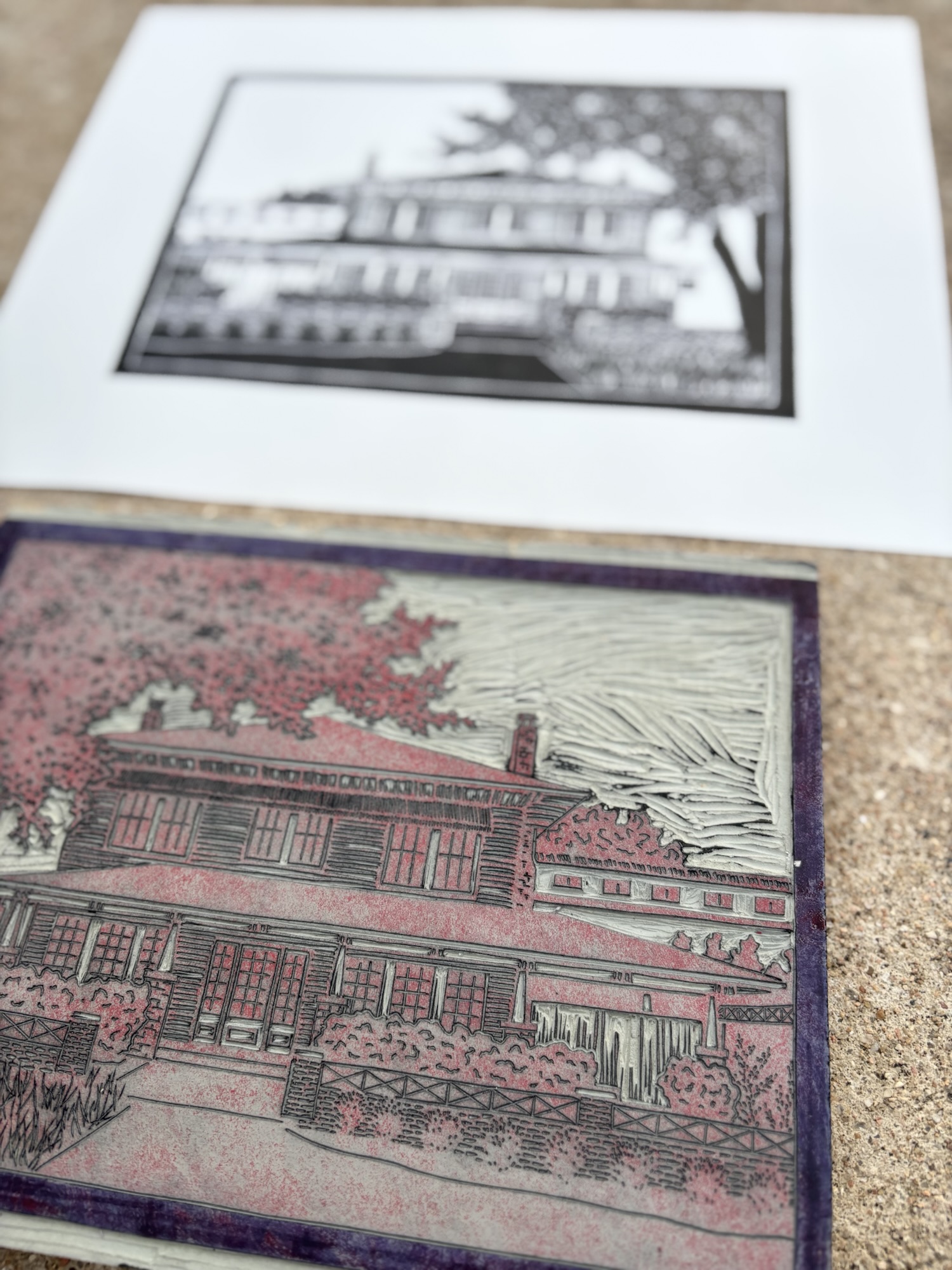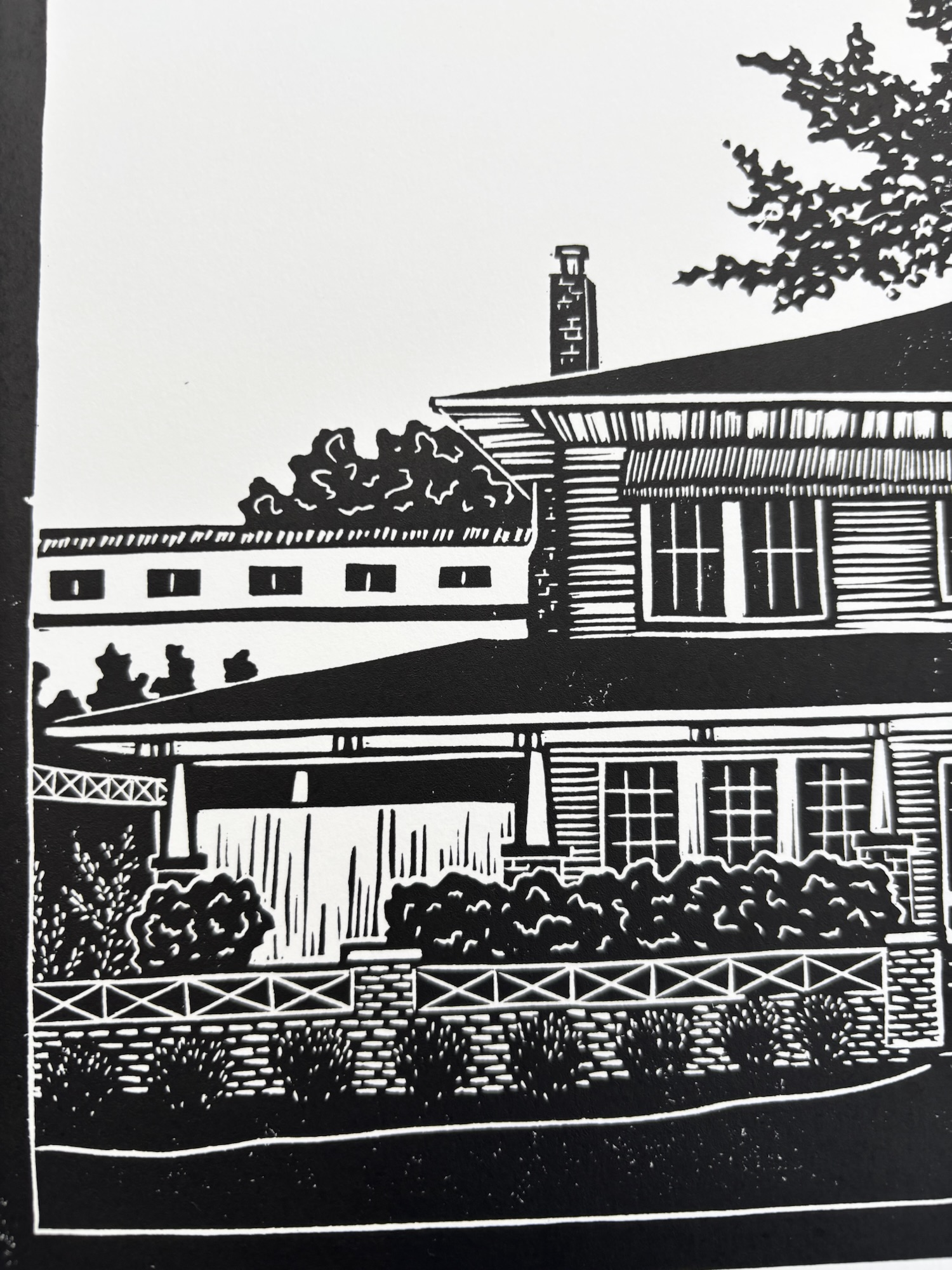 As an artist and resident of Georgetown, I really enjoy creating pieces that connect the viewer to this place I call home. This print is part of a larger collection of original linocut prints I am creating featuring Georgetown locations. The collection currently includes 600 Degrees Pizza, the Palace Theatre, San Gabriel Bridge, Monument Cafe, & 309 Coffee. As an artist, I feel inspired by the small businesses and restaurants in Georgetown that make our town such a special place. I started this collection as a way to highlight some of my favorite spots in Georgetown and the beautiful, historic buildings on the square. As AI images and digital art are on the rise, I’m feeling drawn to the old, traditional, and more time consuming ways of creating art by hand. Printmaking is a slow, careful process. I don’t have a press, so every bit of each print is made completely by hand. The locations in the collection are everyday places of work, play, celebration, creativity, and memory for those of us who live our lives in Georgetown. It seems fitting to honor them with this type of unhurried creation.