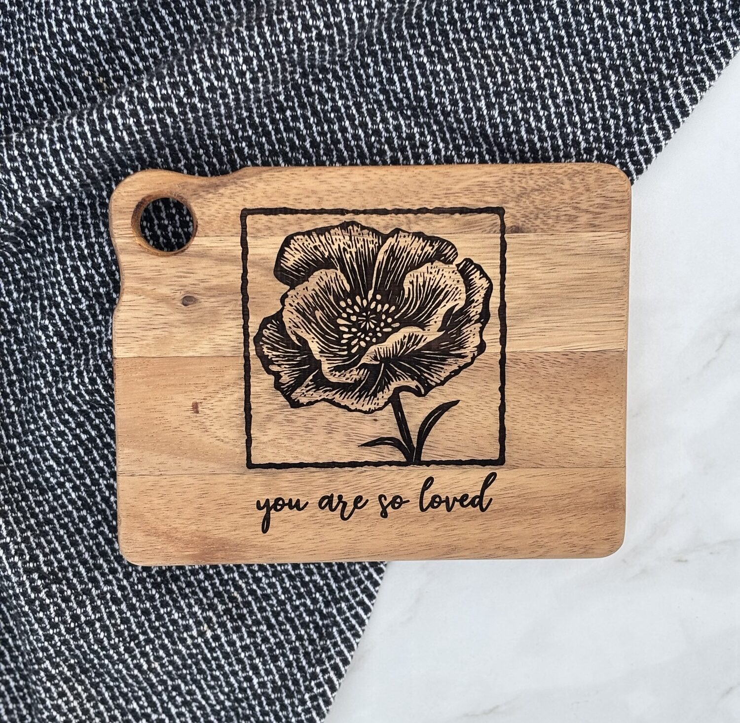 This acacia wood charcuterie board has been engraved with a beautiful floral design and a heartfelt message: “you are so loved”. A special gift that can be displayed and enjoyed everyday, reminding the recipient how loved they are!